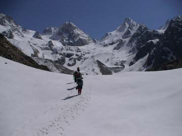 1st Day. First day trek is 11km long. It is from Sankri to Taluka. The path is covered with green trees. Sounds of flowing Har ki Doon river from the gorge below will accompany you though you will not find it all the time. The road is through the reserve forest and your will find many birds, monkeys, rabbits etc. You have to be a little cautious where the roads are broken due to landslides. But after a trek for 5 hours you will be a recharged man when you will reach Taluka, the first day stop. For accommodation you can choose between GMVN rest house and Forest Rest house. Some private hotels are there to serve you food Lunch, Dinner and snacks besides GMVN rest house. 2nd Day Start early in the morning. The path goes down by the side of Forest Rest house to the riverside. Now walk along the river on your left side. Road gradually goes up a little to reach a beautiful green camping site. Lovely place to take a break. Here you will find two paths. The right hand side path goes directly to Datmir village which is a steep one. The other one goes by the side of the river Har-ki-doon on your left side. The narrow path goes through dense forest with some places broken due to landslides. Cross these areas carefully. Suddenly you will find Gangar village on the other side of the river. It is unique village of this route. Till date Droupadi pratha is in effect in these villages. As Draupadi accepted all five Pandava brothers as her husbands, girls of these villages accept all the brothers as their husbands. Perhaps this system was introduced to prevent division of handful of agricultural lands of these remote villages. Have some dry food and water. Relax and walk for another few hours through this green mountain and you will reach Seema. From Taluka to Seema will take around 5 to 6 hours good walking. This is your second day stop and again for accommodation, there are GMVN bungalow and Forest Rest House.3rd day Today we shall take you to Har-ki- Doon valley, the most picturesque valley ever you have seen! Start around 7.30 in the morning. First you have to cross the bridge over the river. Path now goes upward with the river on your right side. Here the path is little bit steep. After some distance the left side path goes to Osla village and the other is your path way to Har-ki-doon. Go further upward and path becomes easier. Walk through the green valley. On the other side of the river a bunch of peaks appear to welcome you to the valley of Har- ki- doon. You will find Kalanag(Black peak), Bunderpunch, Swargarohini and Debasu bugiyal ( valley). The magnificent view will definitely boost up your energy. Have a cup of hot tea at the only tea stall at this remote high field and enjoy every bit of nature which we miss at our civilized life. Again start walking slowly because the path is steep here but sure you will enjoy the walk. After some more walk you will reach the top of Kalkatti Dhar, now it is almost walk on flat lands and through forest. When you cross the narrow bridge of Mataki Nullah your reach Har-ki- doon. Consult your watch and it will be around 1.00 pm. Accommodation is the same as last night, either GMVN rest house or Forest rest house. 4th Day It is a rest day. Acclimatization is required for the next part of the expedition. Har means Lord Shiva and Doon means valley. So Har-ki-doon means valley of Lord Shiva. It is great feeling to be in the valley of almighty Shiva. The valley is covered with soft green grass with colourful flowers. It is very difficult to move without destroying such little flowers. The valley is a three tier valley. At the lower tier Jamdwar glacier is seen from where Har-ki-doon nullah starts. On the top tier stands the FRH and GMVN bungalow. On the back side runs the river Mata ki- gad that is on the second tier. This is the place where you can relieve yourself of all kinds of burdens and enjoy the nature only.5th day Today we are on the second phase of Borasu Pass Expedition. First cross the river Mata-ki- gad and start climbing. After 45 minutes you will reach the point from where you can view the Har-ki- Doon valley for the last time. After taking a rest walk starts along the left side of Marinda nullah over the boulders and grassy field. To reach Mirinda Tal it would take around two hours. It is a natural water reserver created by the obstruction of the boulders. From here the path goes over boulders and glacier. Around 10.00 am you will reach Ratadore. You can camp here. But there is another good camping site which will take another one hour walk. With the sunset, chilling cold will force you to take shelter in the tent. 6th Day - Today we shall the path mostly over boulders. These loose boulders are very much unpredictable. At any time it may cause injury to you. At the end of this path we start walking over snow field. It is on the left ridge of the mountain. After crossing the first snowfield you have to climb the ridge on the right side and come down again. This place is surrounded by peaks from all the sides. This snow field is known as Shaorabira. The time is 10.00 am. It will take good 5 hours to reach Borasu Pass. It is better to camp at Lamdunga, which is another 2.30 hours walk. Definitely you have to consider the weather and permissible time limit to reach Lamdunga. Here you have to camp on a ridge from where you can see the Borasu peak. But Borasu pass is not visible from here. 7th Day- Today is the most important day of this expedition as we shall cross the Borasu pass. Early morning sunlight over Borasu peak and some other peaks will catch your eyes. Walking over snow is much easier in the morning as it remains hard till the sunrays strikes. It helps the ice to melt thus making the snow soft and walking over it very difficult. Today you have to walk over ice fields. After negotiating the first climb go to further right side and you can see the Borasu pass at a distance. The Borasu ridge is visible with some unnamed peaks in a half circle posi